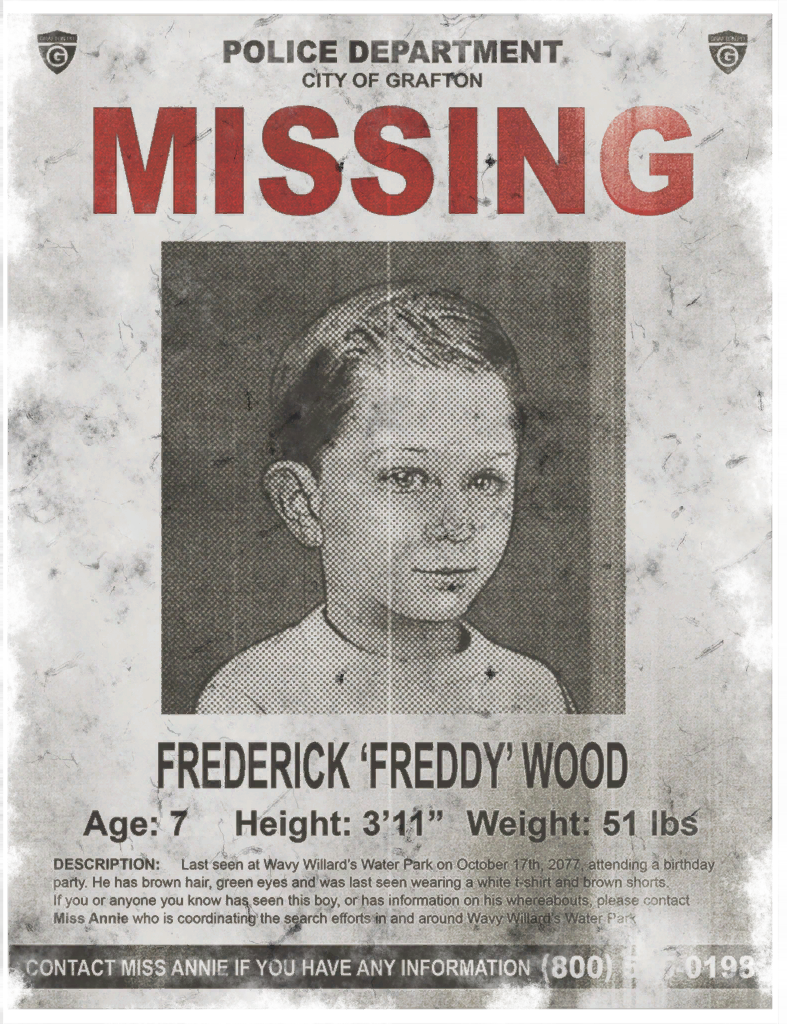 CITY OF GRAFTON FREDERICK 'FREDDY' WOOD AGE: 7 HEIGHT 3'11'' WEIGHT 51 lbs DESCRIPTION: Last seen at Wavy Willard's Water Park on October 17th 2077 attending a birthday, party. He has brown hair, green eyes, and was last seen wearing a white t-shirt and brown shorts. If you or anyone you know has seen this boy, or has information on his whereabouts, please contact Miss Annie, who is coordinating the search efforts in and around Wavy Willards Water Park. CONTACT MISS ANNIE IF YOU HAVE ANY INFORMATION: (800) 0196 |
