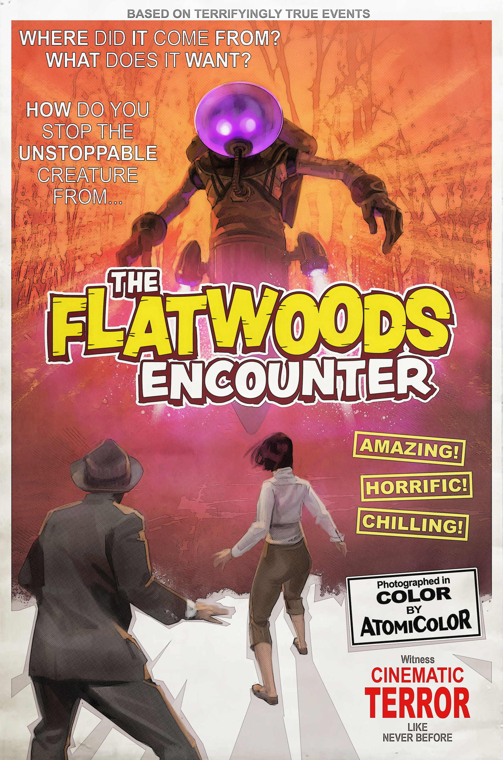WHERE DID IT COME FROM? WHAT DOES IT WANT? HOW DO YOU STOP THE UNSTOPPABLE CREATURE FROM... THE FLATWOODS ENCOUNTER AMAZING! HORRIFYING! CHILLING! Photographed in COLOR BY ATOMICOLOR WITNESS CINEMATIC TERROR LIKE NEVER BEFORE |