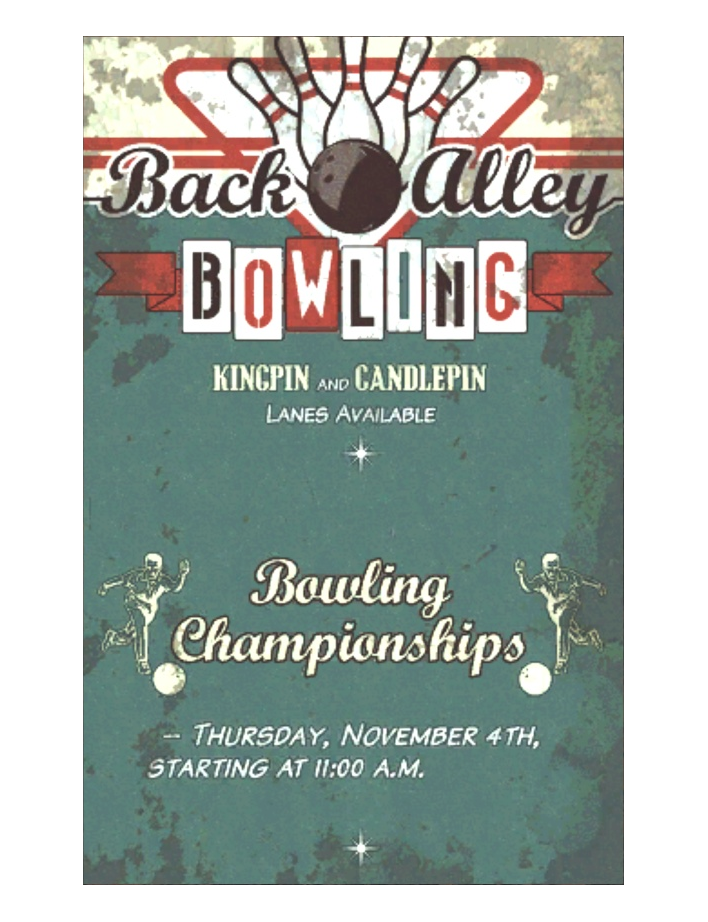 BOWLING KINGPIN AND CANDLEPIN LANES AVAILABLE * Bowling Championships -THURSDAY, NOVEMBER 4th, STARTING AT 11:00 AM |