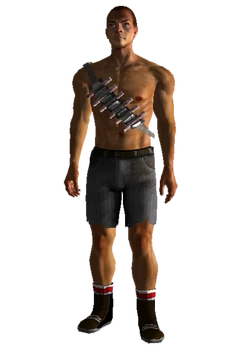 The male version of the outfit consists of a naked upper body wearing only a bandolier holding six sticks of dynamite, paired with grey striped jeans that have been torn at the knee secured by a brown belt and brown boots over white stocks with a red band around the hem. The female version instead is identical to the Powder Gang soldier outfit.