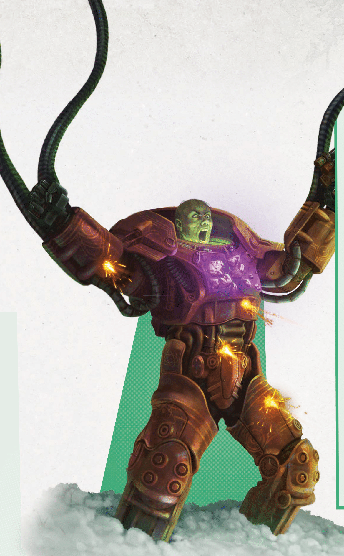 This suit was created by the Last Son of Atom with an unfinished X-01 prototype[Non-game 17] which he modified with runes and crystals, transforming it into a weapon of mass mind-control.[Non-game 18] When the suit is powered its experimental modifications provide details about nearby creatures, shown to its user through the partially transparent helmet piece. It allows him to automatically detect nearby creatures as well as a vague sense of their current actions, health, and emotional state.[Non-game 17] The mind-altering powers extend to the minds of robots.[Non-game 19] The arms of the suit are each affixed with a pair of bio-mechanical tendrils, which serve the Last Son, but act on their own will.[Non-game 17]