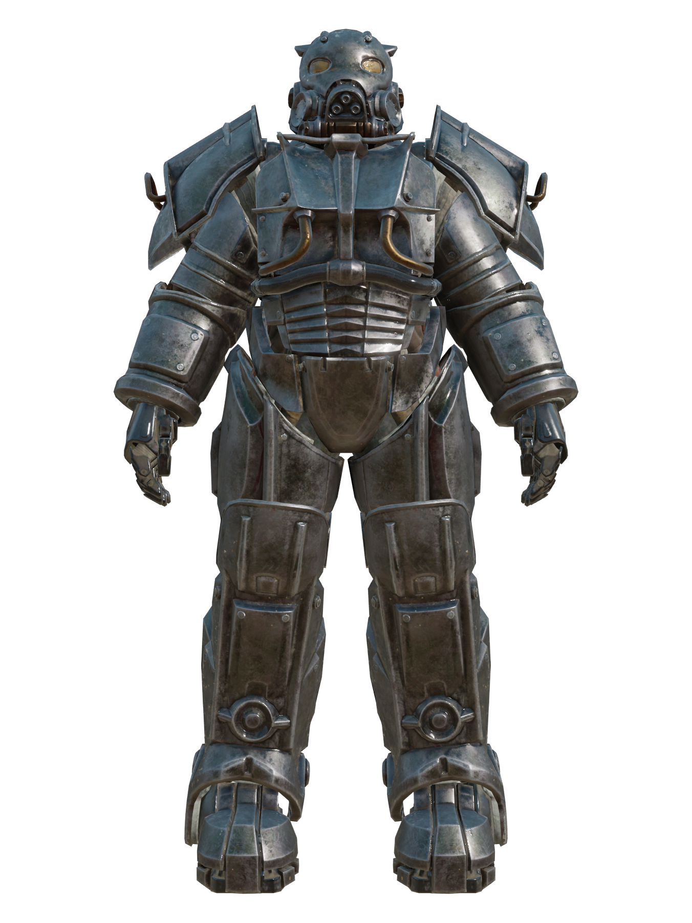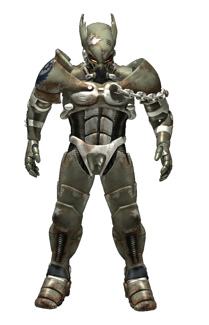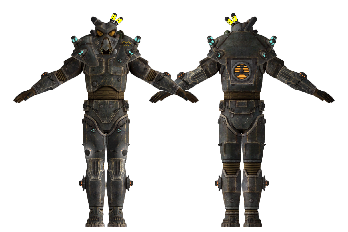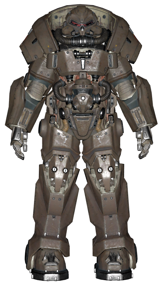 A peculiar power armor with a distinctive, horned look employed by the Eastern Brotherhood of Steel operating in Chicago. Advanced models are composed of lightweight metal alloys and reinforced with ceramic castings at key points.[58]