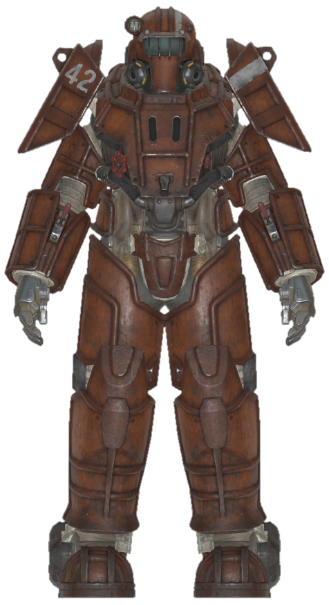 This armor has been salvaged and restored to fighting shape by raiders after the Great War. It appears to incorporate elements of both the T-45 and T-51 models, although it has been rebuilt using primarily scrap metal. Its jury-rigged nature means that it can't protect as effectively against damage as other varieties of power armor. Variants include the Overboss power armor.