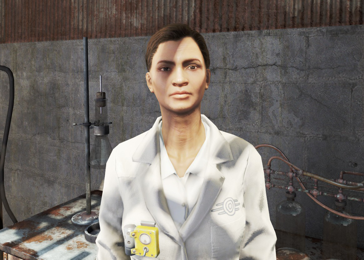 Scara came to Diamond City and settled in with Dr. Duff because of the access to the laboratory equipment she provided.[2] In contrast to Duff, who is more interested in fun experiments and teaching biology lessons, Scara is a much more serious scientist, refusing to deal with visitors and referring them to Duff instead.[3] Though Scara mostly writes and speaks about her in frustration, Duff's dialogue script notes state that she is in a romantic relationship with her,[4] and that they are an odd couple.[5]