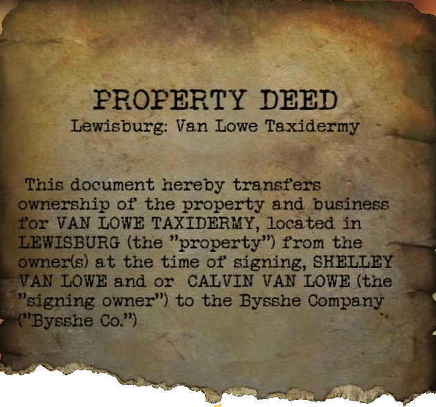 This document hereby transfers ownership of the property and business for VAN LOWE TAXIDERMY, located in LEWISBURG (the "property") from the owner(s) at the time of signing, SHELLEY VAN LOWE and or CALVIN VAN LOWE (the "signing owner") to the Bysshe Company ("Bysshe Co.")