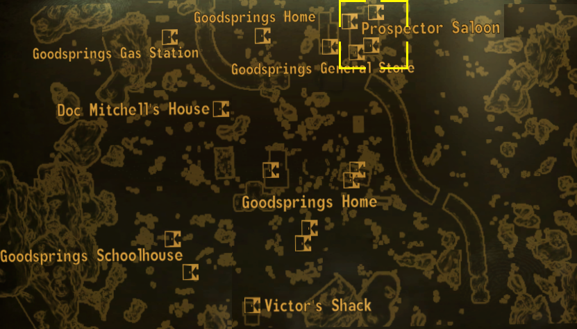 - The Prospector Saloon is located in the same geographical area as the real world Pioneer Saloon in Goodsprings, Nevada. Several aspects of the building are present in the real world location, such as the shape of the building, jukebox, interior bar and mirror, ceiling design, and porch entryway. The geographical location within the town itself is also accurate.