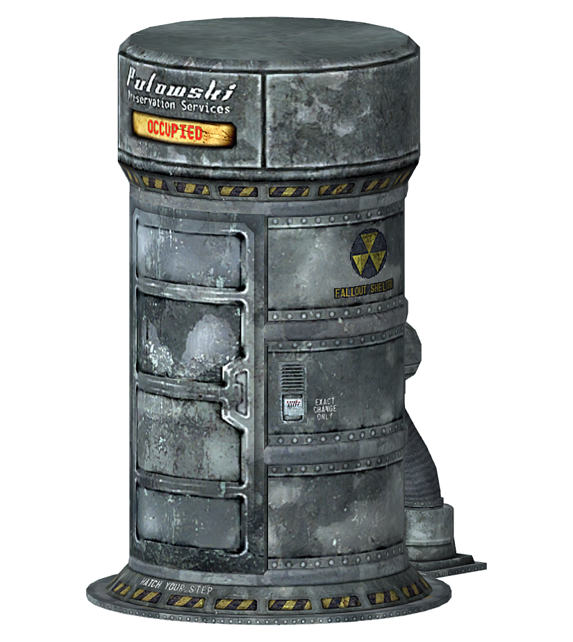 Some of the shelters are in disrepair when encountered. Though apparently coin-operated, the player character can enter by pressing on the coin-slot (no money will be taken). Two centuries later, Pulowski shelters have found a new use in protecting citizens of the wasteland from its dangers; at least one non-player character (Bryan Wilks in "Those!") hides in a Pulowski shelter.