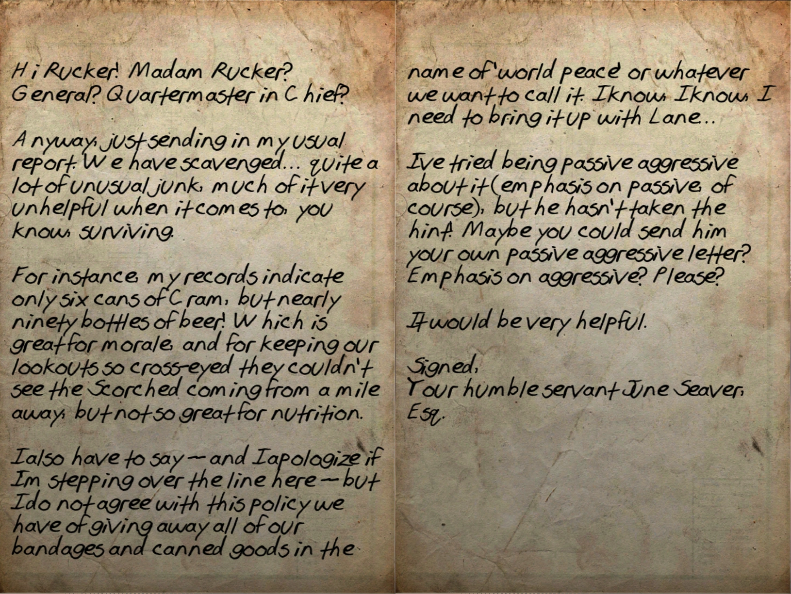 Anyway, just sending in my usual report. We have scavenged... quite a lot of unusual junk, much of it very unhelpful when it comes to, you know, surviving.