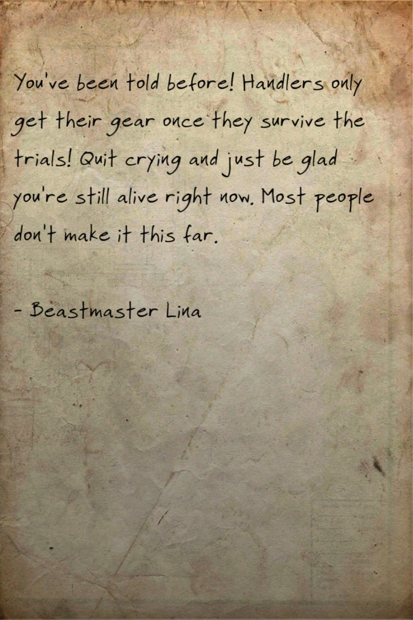 You've been told before! Handlers only get their gear once they survive the trials! Quit crying and just be glad you're still alive right now. Most people don't make it this far.