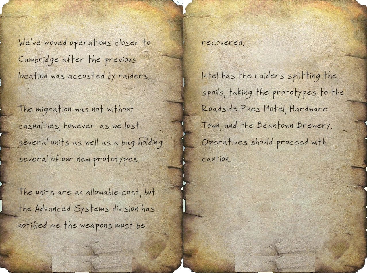 Intel has the raiders splitting the spoils, taking the prototypes to the Roadside Pines Motel, Hardware Town, and the Beantown Brewery. Operatives should proceed with caution.