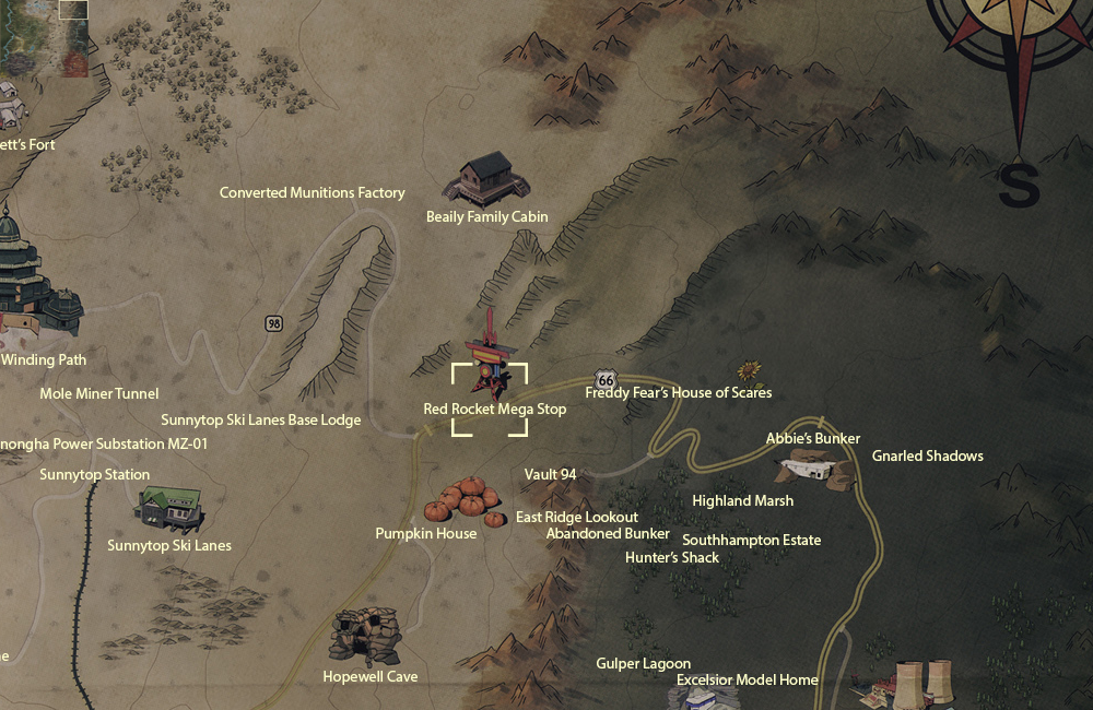 Red Rocket Mega Stop, or the Red Rocket Highway Mega Stop,[1] is a location in the Savage Divide region of Appalachia. It is a public workshop with claim and defend event quests.