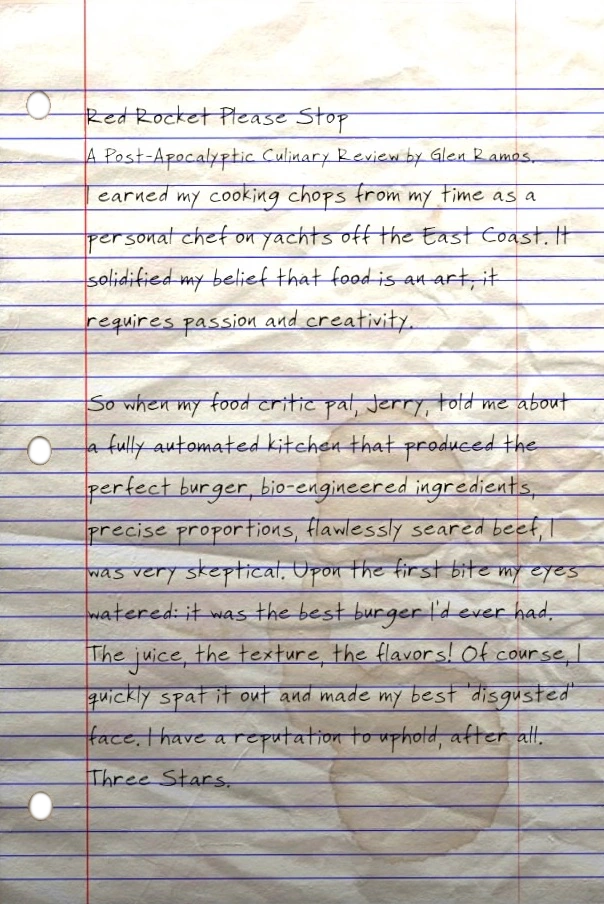 So when my food critic pal, Jerry, told me about a fully automated kitchen that produced the perfect burger, bio-engineered ingredients, precise proportions, flawlessly seared beef, I was very skeptical. Upon the first bite my eyes watered: it was the best burger I'd ever had. The juice, the texture, the flavors! Of course, I quickly spat it out and made my best 'disgusted' face. I have a reputation to uphold, after all. Three Stars.