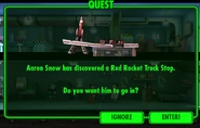 The quest The Red Rocket Reveal! takes place in a truck stop known as Red Rocket headquarters. An exploring dweller may also stumble upon a truck stop and give the player the option to explore it.