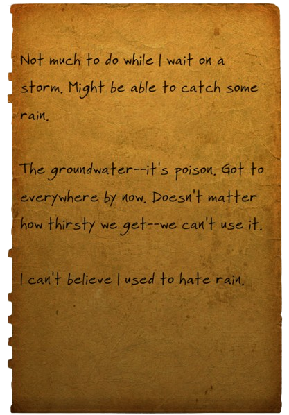 The groundwater--it's poison. Got to everywhere by now. Doesn't matter how thirsty we get--we can't use it.