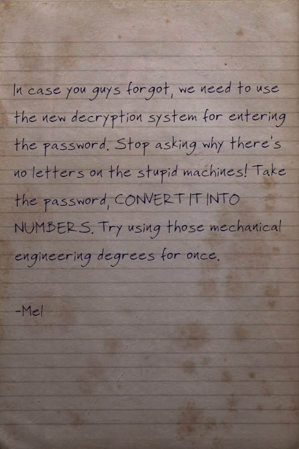 In case you guys forgot, we need to use the new decryption system for entering the password. Stop asking why there's no letters on the stupid machines! Take the password, CONVERT IT INTO NUMBERS. Try using those mechanical engineering degrees for once.