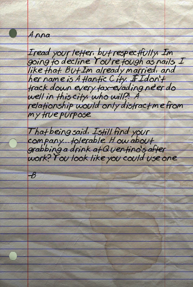 I read your letter, but respectfully, I'm going to decline. You're tough as nails, I like that. But I'm already married, and her name is Atlantic City. If I don't track down every tax-evading ne'er do well in this city, who will?! A relationship would only distract me from my true purpose.
