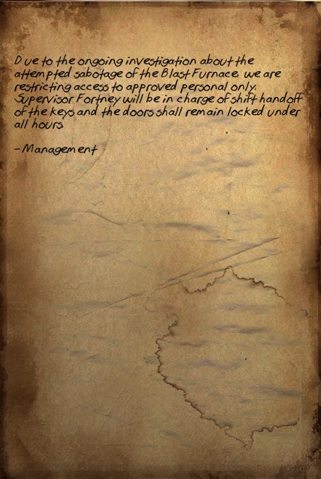 Due to the ongoing investigation about the attempted sabotage of the Blast Furnace, we are restricting access to approved personal only. Supervisor Fortney will be in charge of shift handoff of the keys and the doors shall remain locked under all hours.