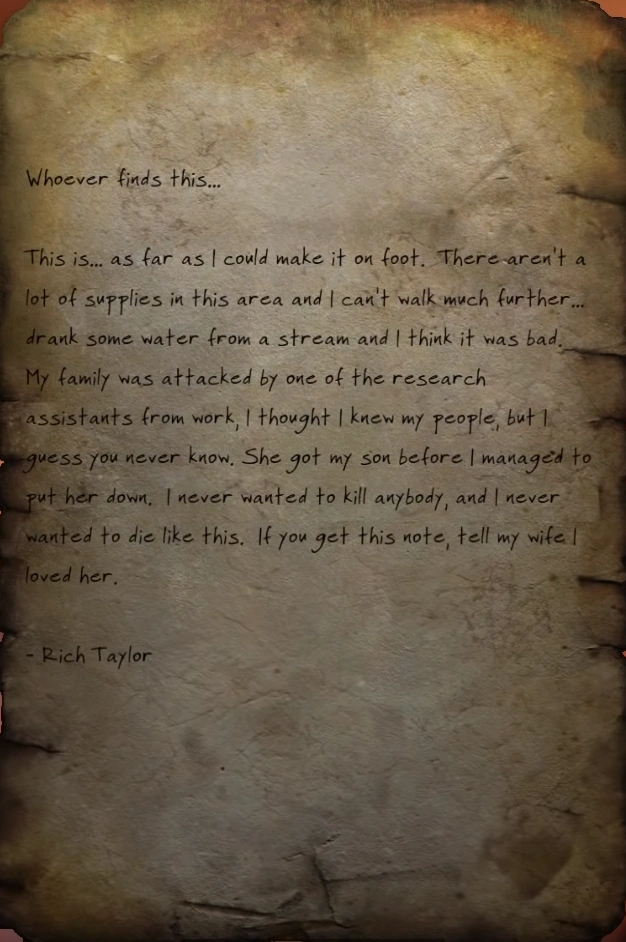 This is... as far as I could make it on foot. There aren't a lot of supplies in this area and I can't walk much further... drank some water from a stream and I think it was bad. My family was attacked by one of the research assistants from work, I thought I knew my people, but I guess you never know. She got my son before I managed to put her down. I never wanted to kill anybody, and I never wanted to die like this. If you get this note, tell my wife I loved her.