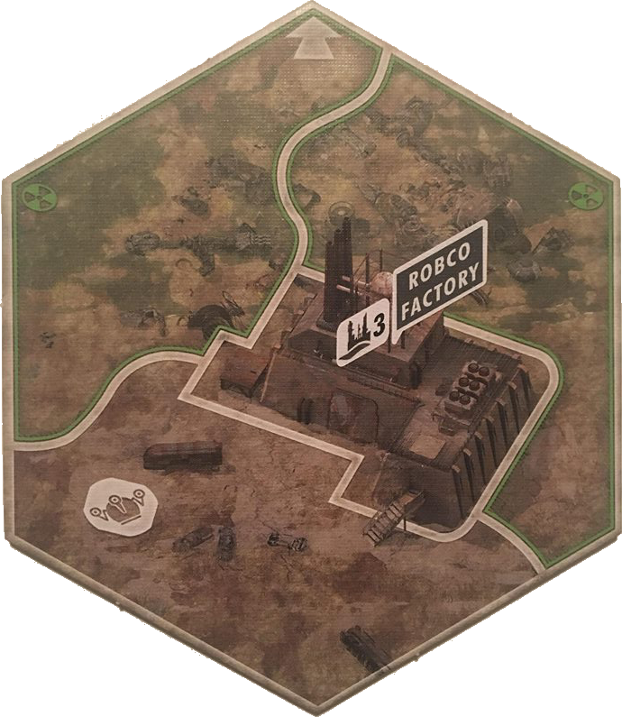 The RobCo factory tile has four spaces in it, and the centermost space contains the level three settlement. The northwestern and northeastern spaces are radioactive, and the southmost space is empty.