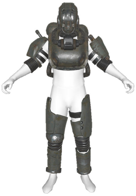 The armor is made out of random robot parts. The chest piece bears a resemblance to the torso of a sentry bot , albeit much smaller to fit a human collar, while the arm and leg pieces appear to be generic pieces of machined metal. There are three helmet variants - eyebot , Assaultron , and sentry bot , seemingly made out of the head parts of the aforementioned robots.
