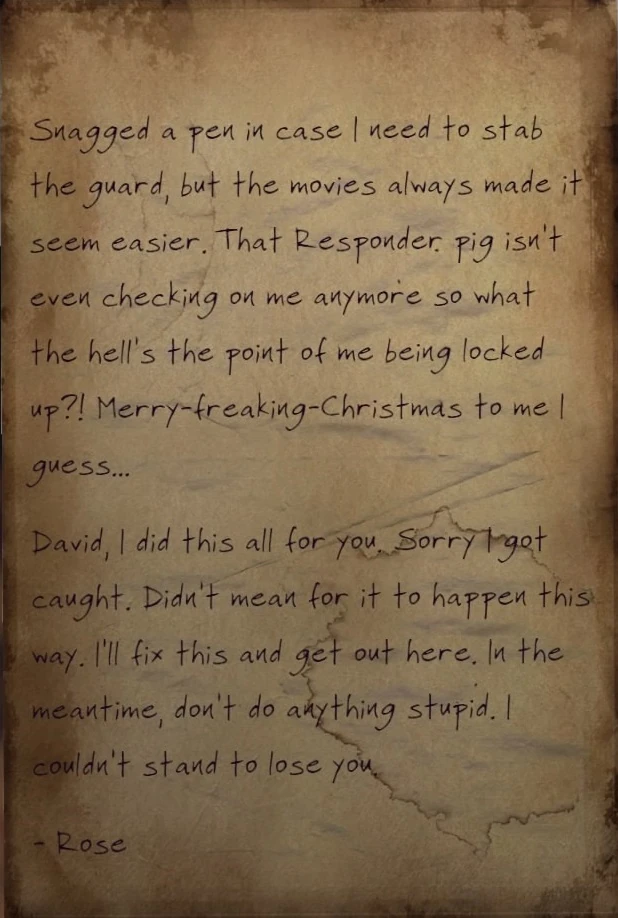 Snagged a pen in case I need to stab the guard, but the movies always made it seem easier. That Responder pig isn't even checking on me anymore so what the hell's the point of me being locked up?! Merry-freaking-Christmas to me I guess...