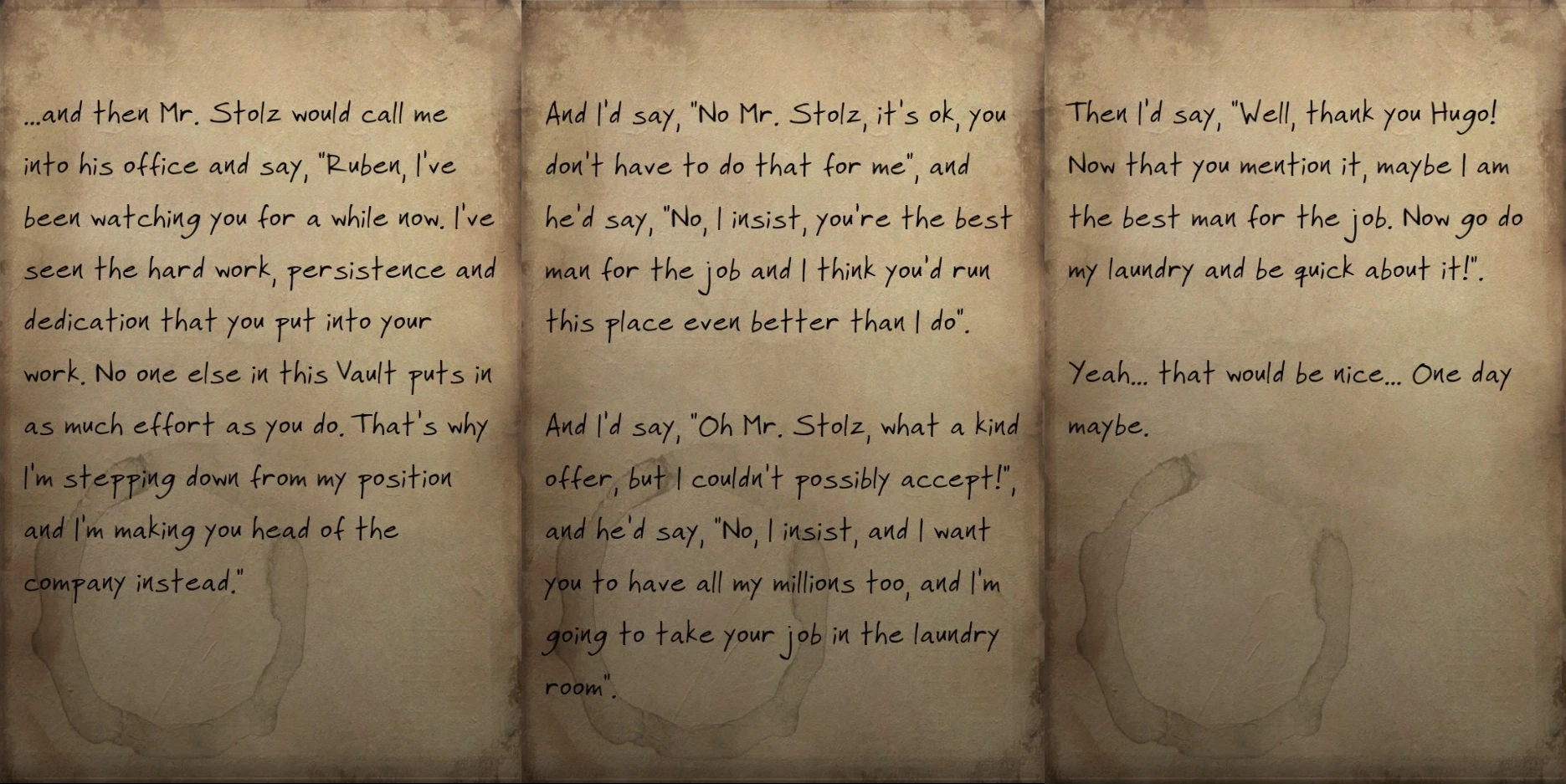 ...and then Mr. Stolz would call me into his office and say, "Ruben, I've been watching you for a while now. I've seen the hard work, persistence and dedication that you put into your work. No one else in this Vault puts in as much effort as you do. That's why I'm stepping down from my position and I'm making you head of the company instead.".