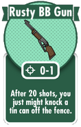 The rusty BB gun is a weather-worn lever action toy gun. It is the worst weapon in Fallout Shelter and, with a 50% chance of dealing 0 damage per attack, it has the weakest minimum damage in the game. This arguably comically low damage output makes it a less effective weapon than a dweller's fist.