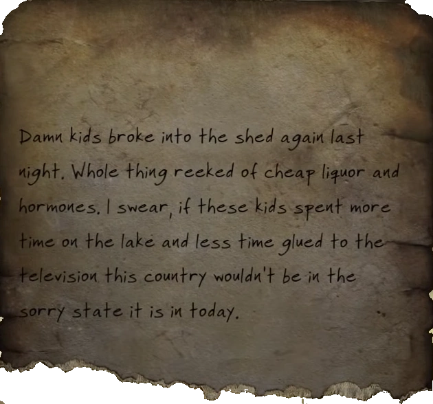 Damn kids broke into the shed again last night. Whole thing reeked of cheap liquor and hormones. I swear, if these kids spent more time on the lake and less time glued to the television this country wouldn't be in the sorry state it is in today.