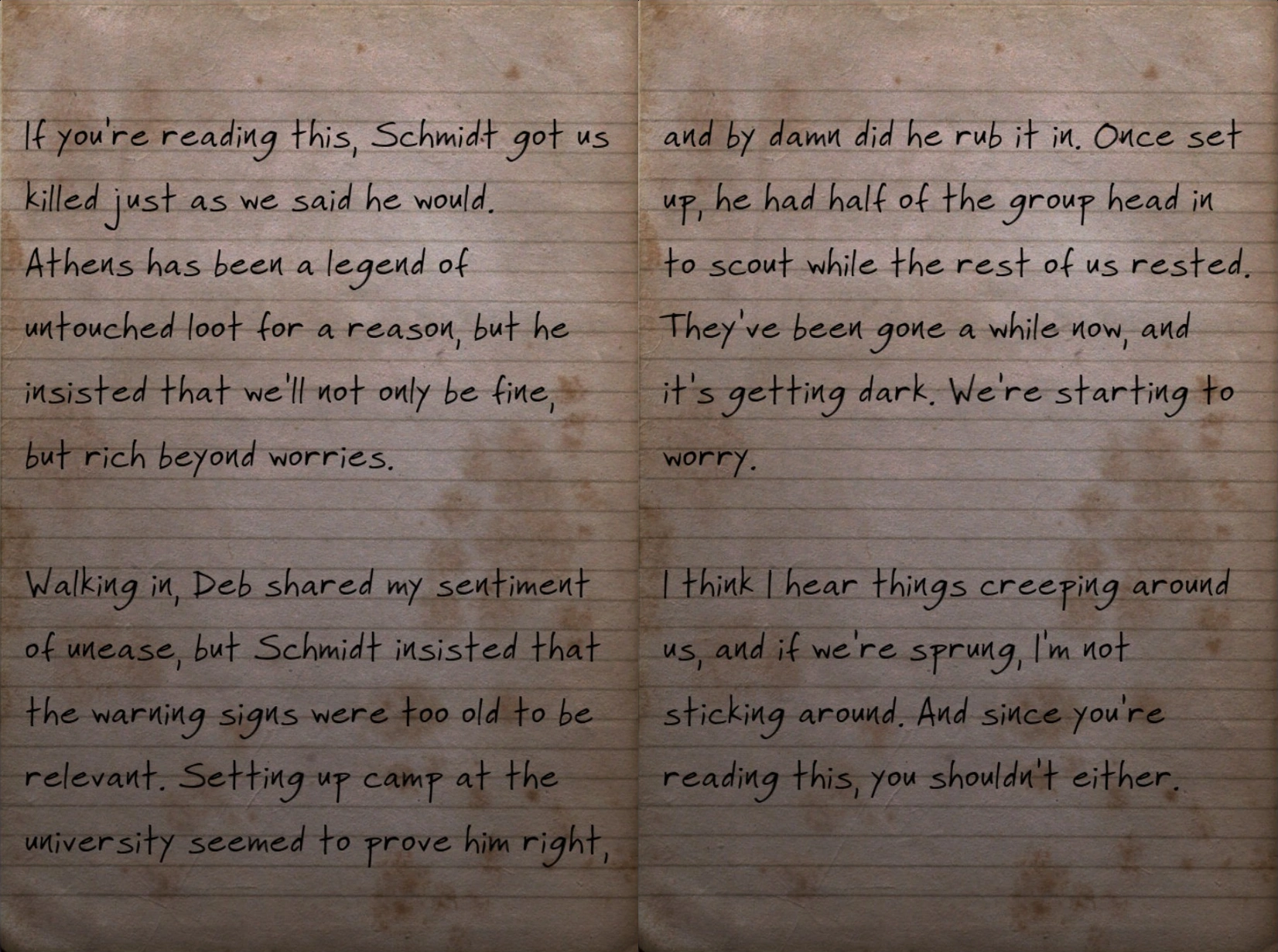 If you're reading this, Schmidt got us killed just as we said he would. Athens has been a legend of untouched loot for a reason, but he insisted that we'll not only be fine, but rich beyond worries.