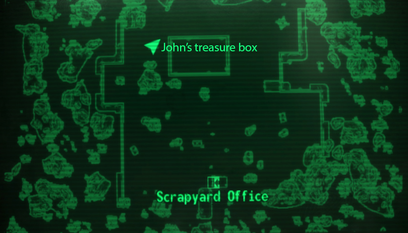 - Near the side entrance steps of a bus in the northwestern part of the scrapyard there is an ammunition box named John's Treasure Box (see local map) containing Grognak the Barbarian, Guns and Bullets, and U.S. Army: 30 Handy Flamethrower Recipes. One must have a Lockpick skill of at least 75 to open the box. The other way to open it is to obtain John's key, which is available in a random encounter. The ammunition box can be difficult to see amongst the burnt-out husk of the bus. While standing in the wreckage, it is at the bottom of the small set of steps.