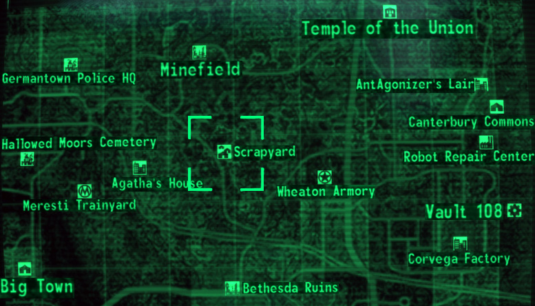 The scrapyard is a salvage yard in the Capital Wasteland in 2277. Aside from heaps of junk vehicles, it is the place where Dogmeat (a possible companion) will first be encountered, fighting a small band of raiders.