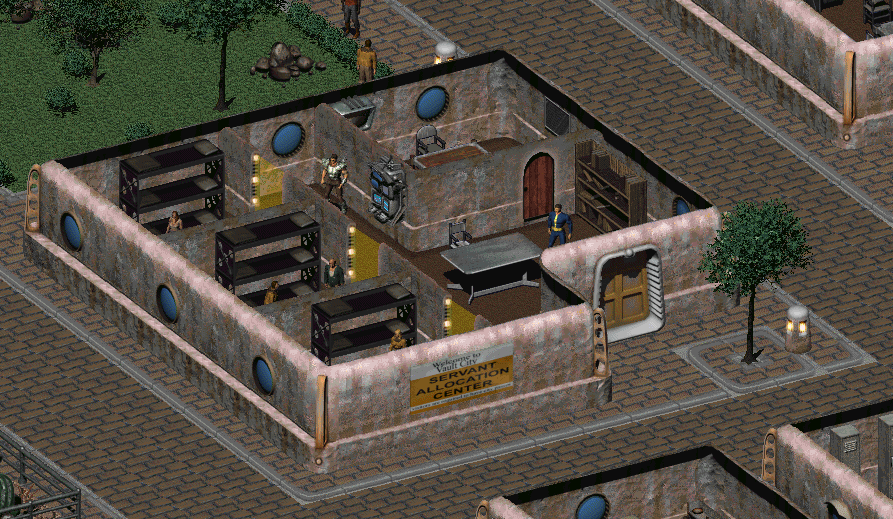 The Servant Allocation Center is an administration building in Vault City Downtown, handling all slavery-related affairs in Vault City.