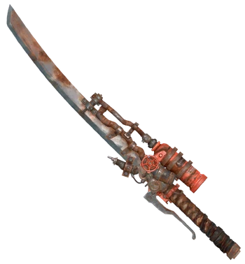 Unlike the Shishkebab made in the Capital and Mojave wastelands, the Commonwealth version is compact. It uses a more potent fuel made from a Schoelt canister, so a motorcycle fuel tank is no longer required, although a motorcycle handbrake is still present. Also, the basis of the weapon is a modified wakizashi rather than a makeshift sword made from a lawnmower blade.