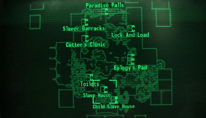 The slave house is a simple rectangular building made up of a single room. Several mattresses lay on the floor to accommodate the slaves living there. If the player character has taken the Strictly Business quest, any 'VIP' slaves they have captured will appear within the slave house, but any non-VIP non-player characters that they have enslaved (such as raiders and Enclave soldiers) are removed from the game when they arrive. The player character can attempt to free them and in the process might accidentally detonate the collar.