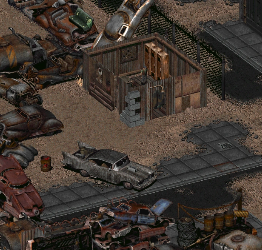 Smitty's junkyard is a location owned by Smitty in the west side of The Den in 2241.