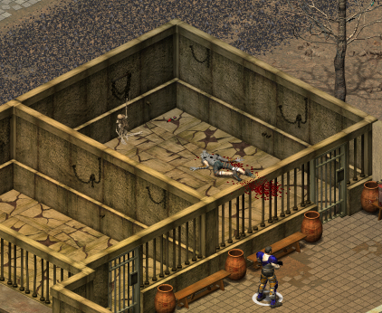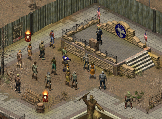 When ready, send well-armored close-range types up beside the fence-gate. This will trigger the dialogue and subsequent carnage. You get 2000 XP for killing the head assassin. Inside the building is the mayor and even more non-kosher flags. As soon as you talk to him, the fence-gate leading toward the podium opens (though it remains locked) and you get 3000 XP.