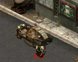 The South edge of the roof has a fire escape leading down to a balcony with a trapped door. Sneak inside to discover a sleeping raider defended by anti-personnel mines. You can disarm and collect them. There is also a crate containing regular-flavor lockpicks. You have now defeated all the enemies in the first part of the map and can run around talking to and robbing the civilians as you please. The guy behind the counter in the two-story house (the only remaining building West of the road) has some drugs. Upstairs is a woman staring out the window; you can steal from her "Papers (no desc.)". One of the patrons of Joe's Tavern has some After Burner gum. You can take some beer from the bar.