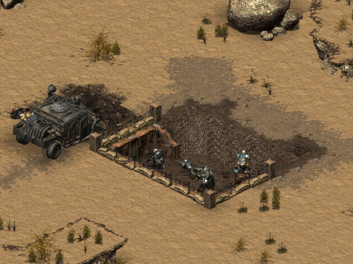Go to point 1 and just drive by all the super mutants and let your squad do all the work. After you arrive at point 1, you will then be asked to go to point 2. You cannot get the APC through all the narrow spaces, so you'll have to go on foot. A good way to take out all of the super mutants hiding in the maze, is to drive the APC Diagonally on top of the maze, and shoot them down as the Mutants appear, this way you are protected and your squad doesn't get cornered in the tight spaces. After you reach the gate near the super mutant base you'll see a man lying down, that is Burke. Talk to him and he'll ask you to disarm (and take) the C4 that is attached to him. Use your Traps skill and then after you defuse the C4, he'll tell you about his undoing and then appears to commit suicide. DO NOT go inside the super mutant base from this entrance because the traps are nearly undetectable and you will be easy pickings for the mutants who carry Browning M2s with .50 Cal DU rounds. Even if you go there with advanced power armor, they'll take you out quickly. However, if you kill one (or more), it will grant several hundred experience points. But it is a very difficult fight since they are well armed as well as tough.