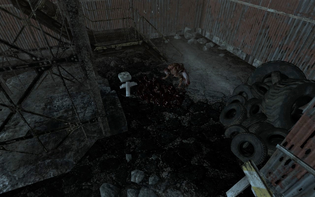 2 | Jump on top of the generator just behind to find a plank and climb back over the fence and back up the stairs that were used to get into the dumpster. Facing north, there is another set of stairs that head down to the ingots near a pile of gore and a trog. |