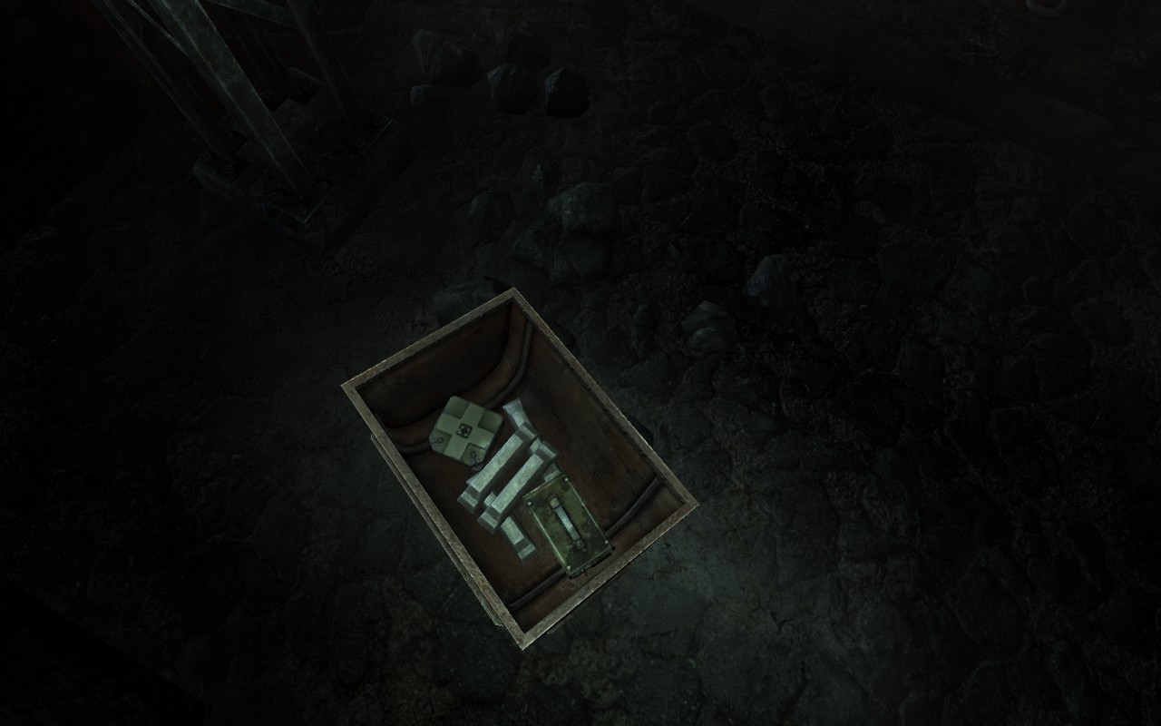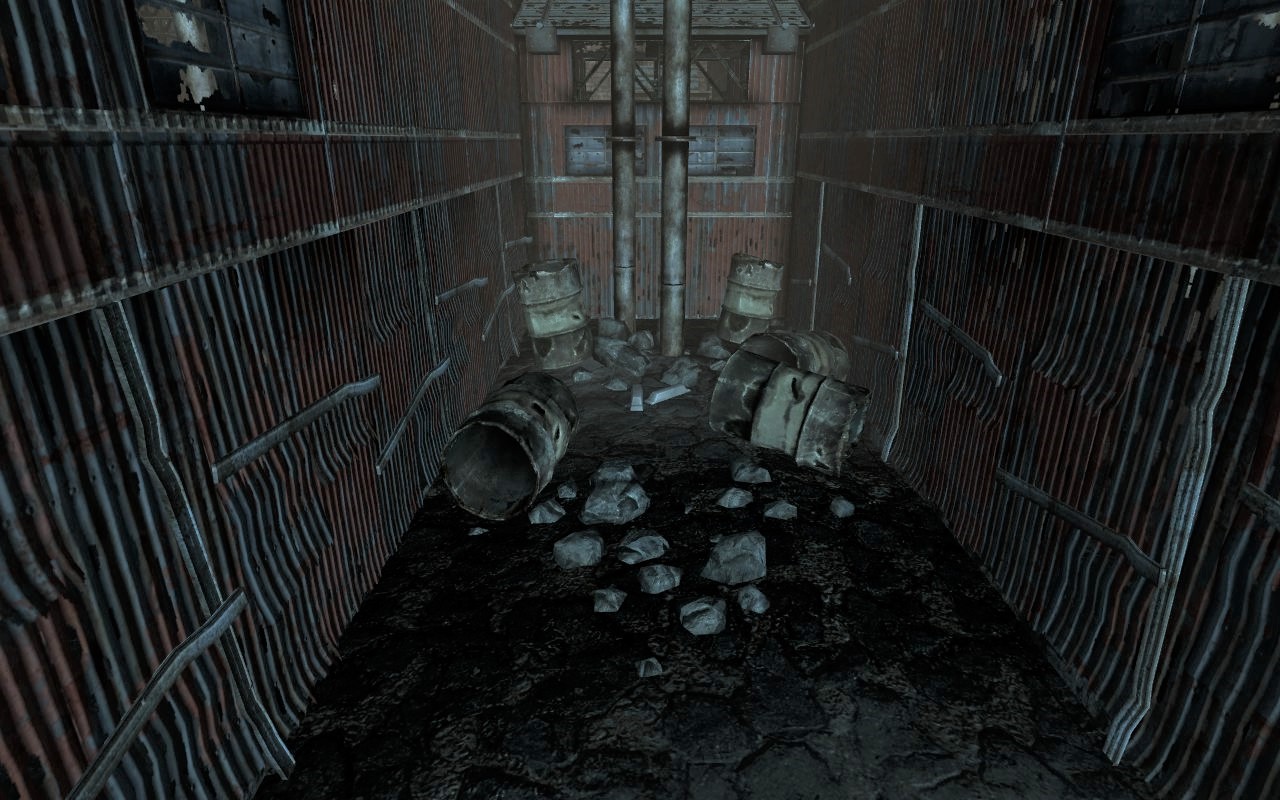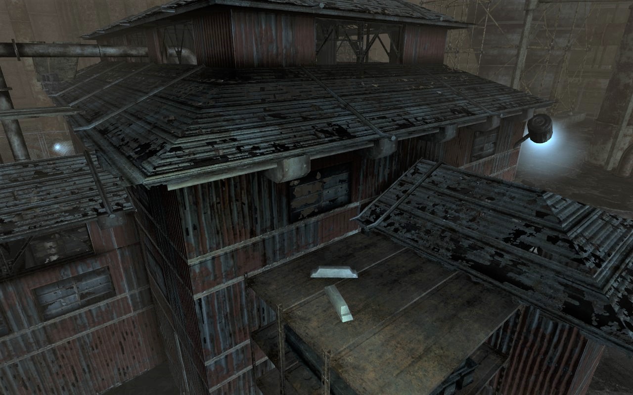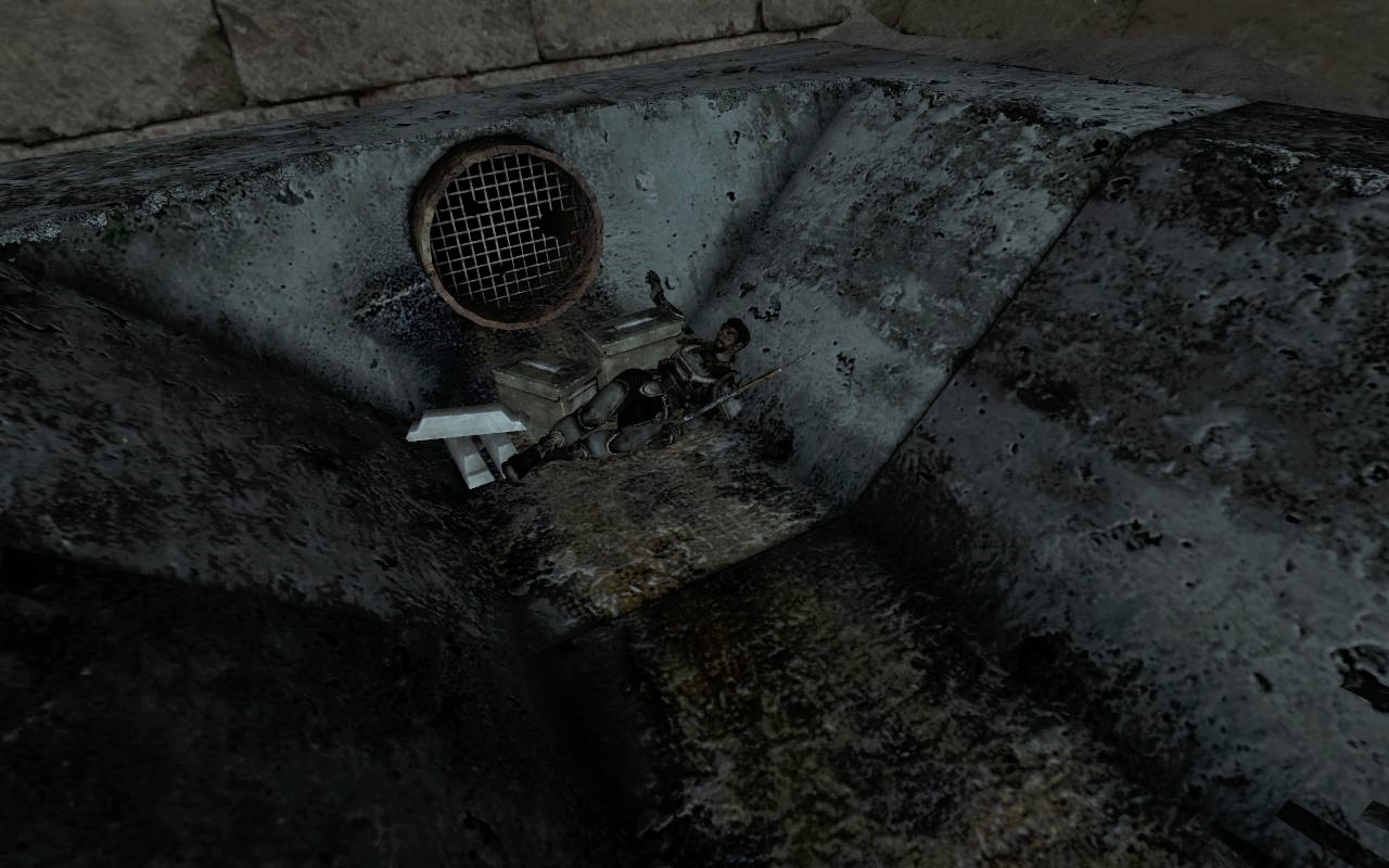 4 | Turn around and jump back onto the catwalk where the pipe bends. At the wooden planks, drop down to the building below and head for the western edge of the roof. Drop down to the ground and head north around the corner of the building, then turn left down the first narrow alley. There is an upright mining cart containing 4 ingots, first aid kit, and an ammunition box. |
