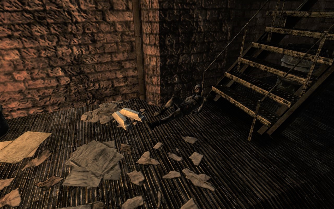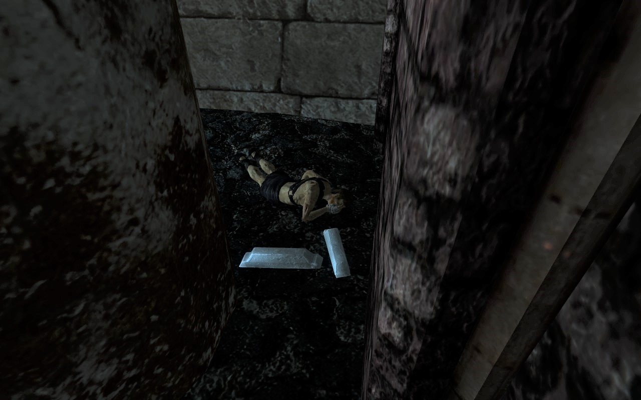 2 | Continue across to the other side of the bridge. Stay on the roof of the building and head to its western end. A dead Pitt slave will be on the left at the top of the stairs, and around the corner to the right, there are two ingots sitting on a lower roof facing northwest. |
