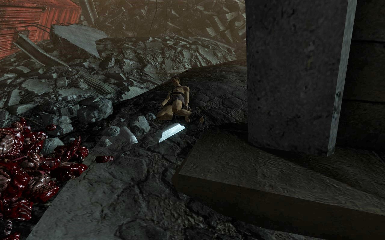 2 | To the north, a wall leads eastwards towards a fence. Follow the fence around the corner to the right behind several barrels. At the end, there is a dead slave, a combat shotgun, shells, and two ingots. |