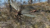 Fragile but agile, the stingwing can be taken down in relatively few shots even at mid-level. It is, however, extremely fast, hits fairly hard, and fond of a "dive-bombing" tactic where it circles the player character and rushes in to hit once before returning to circling. They are often encountered in groups of up to five and can be a harsh problem due to their speed and erratic movements, which can combine to make them very hard to hit without V.A.T.S. Another tactic the stingwing tends to use is to rush at the player character in single file.