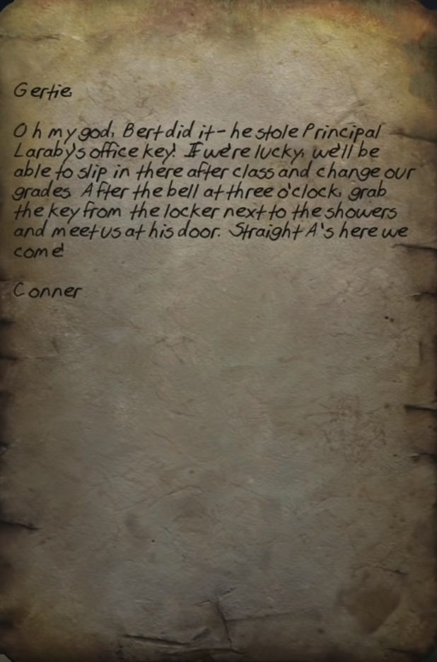 Oh my god. Bert did it - he stole Principal Laraby's office key! If we're lucky, we'll be able to slip in there after class and change our grades. After the bell at three o'clock, grab the key from the locker next to the showers and meet us at his door. Straight A's here we come!