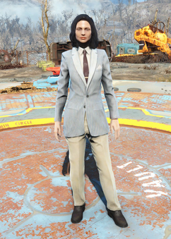 The striped suit is a pre-War business suit with a pinstriped blue blazer, light brown slacks, white dress shirt, and a dark red tie. It provides a bonus of +2 Charisma when worn.