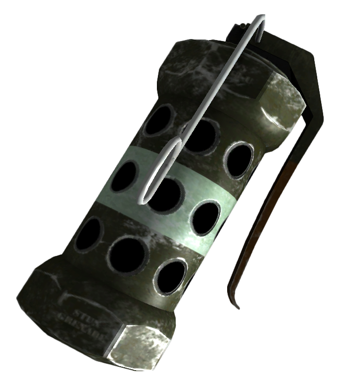 This grenade cut from Fallout: New Vegas was meant to inflict fatigue damage to targets, allowing for a less-lethal explosive weapon. Typical of stun grenades, a bright light accompanies the detonation, which can momentarily blind or blur vision.