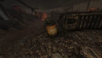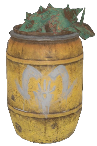 A yellow plastic barrel with the rust raider's logo on it, filled with scrap metal that Beastmaster Lina uses for armoring deathclaws.