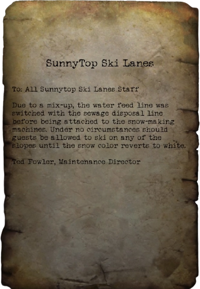 Due to a mix-up, the water feed line was switched with the sewage disposal line before being attached to the snow-making machines. Under no circumstances should guests be allowed to ski on any of the slopes until the snow color reverts to white.