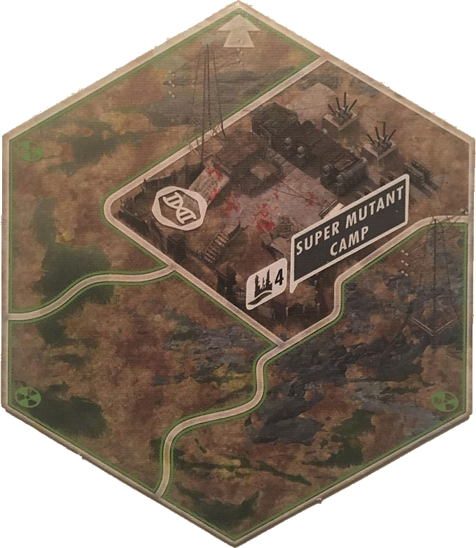 The super mutant tile has four spaces in it, the easternmost space is the level for ruin as well as a super mutant spawn location. The southern, northern, and eastern spaces are radioactive.
