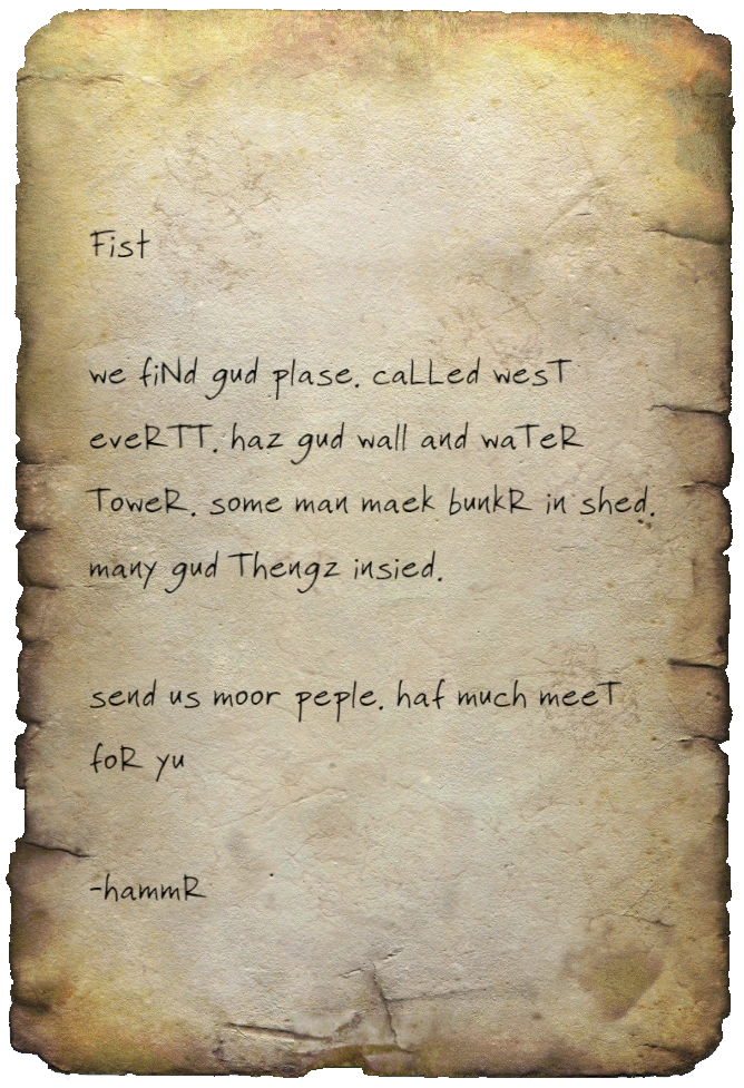 we fiNd gud plase. caLLed wesT eveRTT. haz gud wall and waTeR ToweR. some man maek bunkR in shed. many gud Thengz insied.